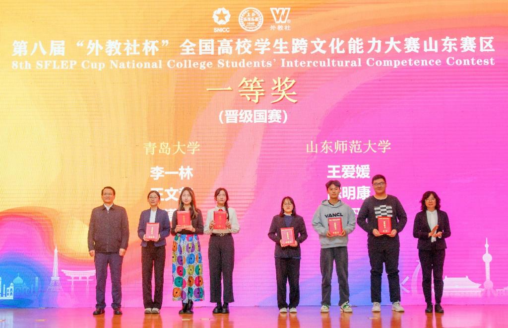山东赛区省赛参赛团队数量再创新高,共有60所本科院校学生团队参加省赛阶段的奖项争夺,位居全国各省首位。比赛中,各参赛团队准备充分、发挥出色,围绕“多元文化生活”等主题完成了跨文化交际案例的开发、分析与展示,并随机抽取中国故事相关题目阐释观点。参赛团队以精彩表现展现了扎实的跨文化知识储备、优秀的多元文化理解能力和跨文化交际能力,彰显了本土文化自信与全球文化视野,生动诠释了“和而不同,美美与共”的国际文化交流理念。我校三名参赛同学在比赛中努力拼搏,凭借出色的语言水平、创新能力和合作精神,得到了评委嘉宾的一致认可,最终取得第一名的优异成绩,荣获山东赛区一等奖,将于今年12月赴上海参加全国比赛。
