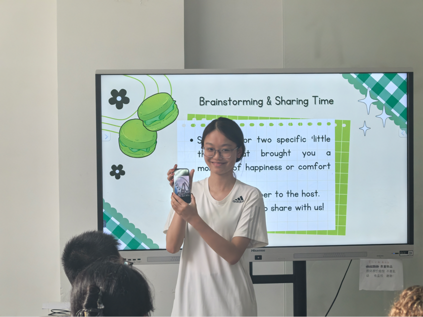 接下来的幸福瞬间分享环节更是点燃了在场同学们的热情,大家纷纷写下自己的幸福瞬间,外籍教师Diane和很多同学受邀上台分享了近期使自己开心的瞬间——旅途趣事、好友相聚、美丽的花束、期待已久的演唱会等等,愉悦的心情在教室里流动,开心的瞬间带给大家欢乐。