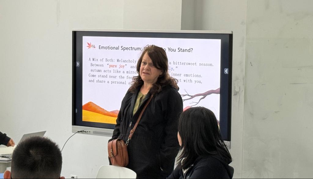 主持人借助“秋日情绪词汇指南”,将情绪词汇归纳为积极庆祝、伤感反思与复杂混合三类,并配合释义与例句,帮助大家拓展表达方式。随后的“情绪光谱互动”环节成为一大亮点:参与者在“纯粹喜悦”与“深沉伤感”之间选择自己的情感立场,并分享个人秋日记忆,进一步加深了对秋日情绪的理解。外教Debra分享道,秋天是她最爱的季节,并引用了一句诗意的话语表达心情:“Delicious autumn! My very soul is wedded to it, and if I were a bird I would fly about the earth seeking the successive autumns.”